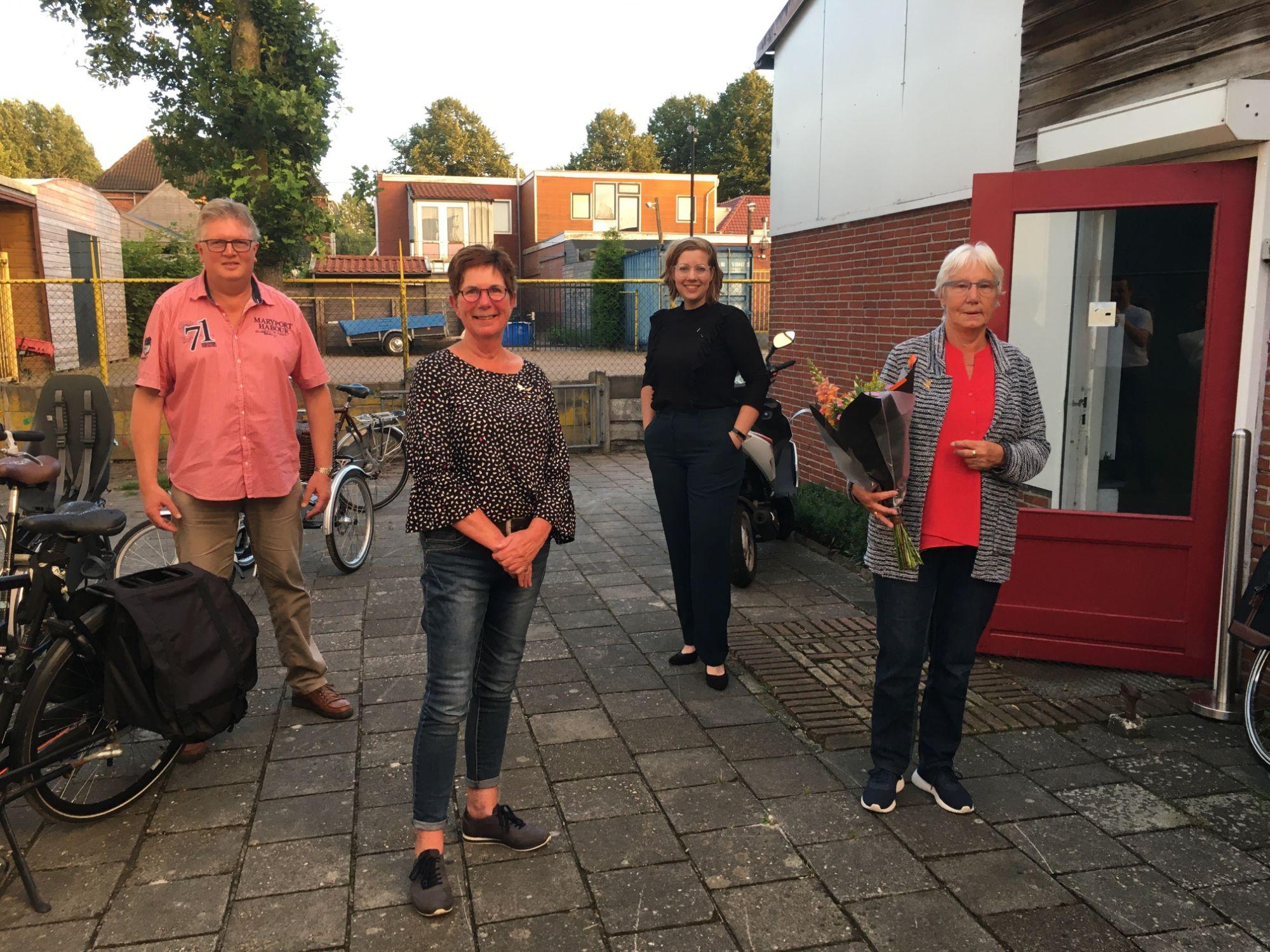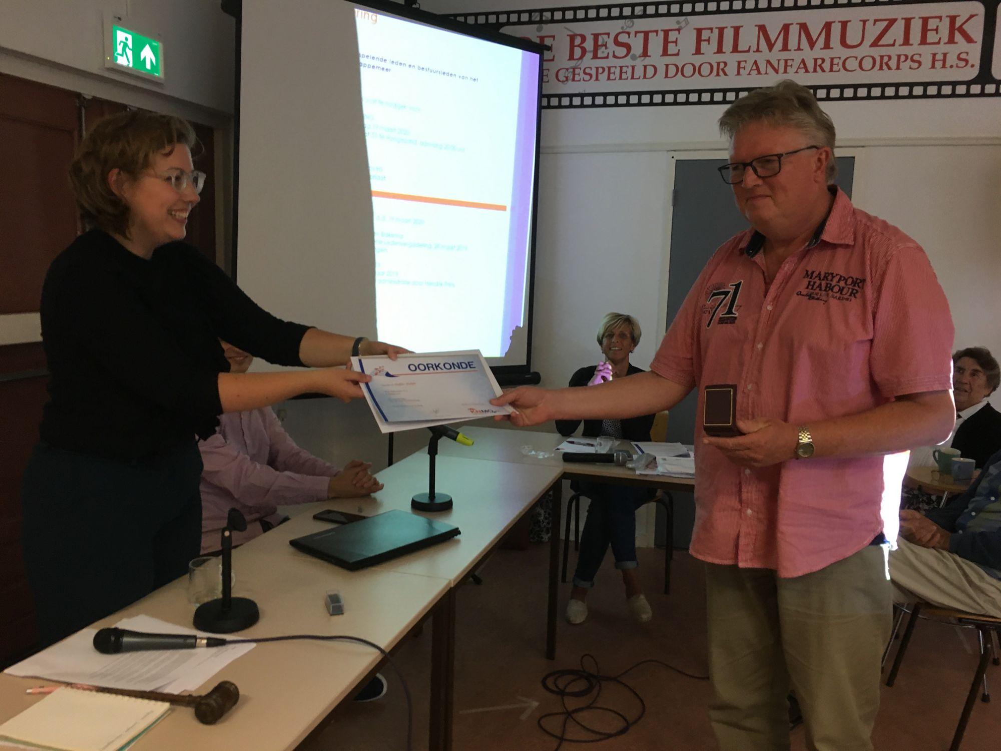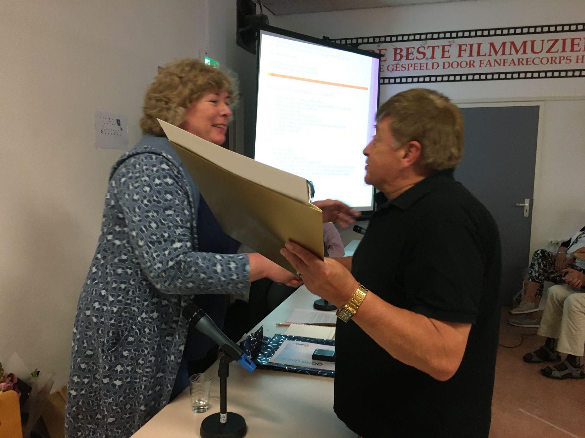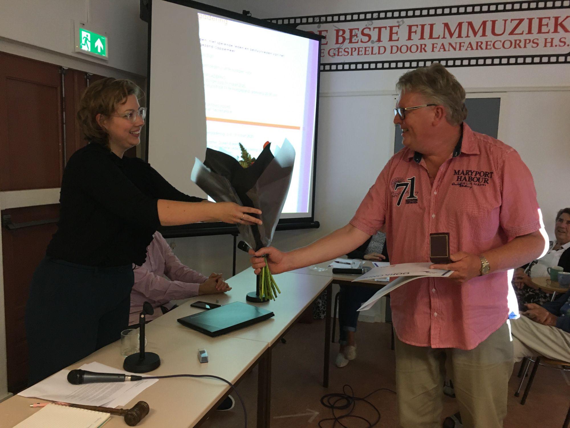 Gisteren vond de uitgestelde ledenvergadering van onze vereniging plaats. Vanwege de corona-versoepelingen kon deze vergadering eindelijk plaatsvinden, maar iedereen moest zich natuurlijk wel aan de anderhalve meter richtlijnen houden. Het hoogtepunt van de vergadering is ieder jaar weer de huldiging van de leden die 25, 40 of 50 lid zijn of zo lang muzikant zijn. Dit jaar waren dat Lidy, Stoffer, Hilda en Dorien. Lidy werd gehuldigd omdat ze 50 jaar lid is van de vereniging, Hilda was 40 jaar lid en Dorien en Stoffer werden gehuldigd omdat ze respectievelijk 25 jaar en 40 jaar muzikant waren. Hoewel Dorien was eigenlijk al 27 jaar muzikant, dus voor haar was het zeker een verrassing. Naast deze huldigingen werd de oud-papier commissie bedankt voor hun jarenlange werk en verdiensten voor de vereniging. Bé kreeg bloemen voor zijn bestuurswerk van de afgelopen jaren en Margriet werd zelfs 'lid van verdienste' vanwege haar jarenlange bestuurswerkzaamheden. Vanwege de corona maatregelen kon de voorzitster geen speldjes opspelden, maar indien mogelijk, waren er familieleden gevraagd deze eer te verrichten.
