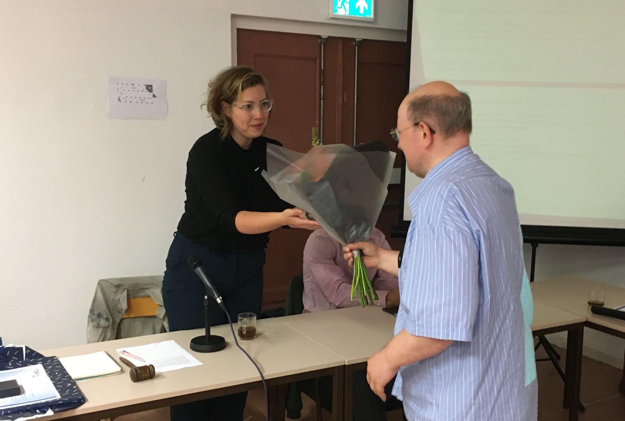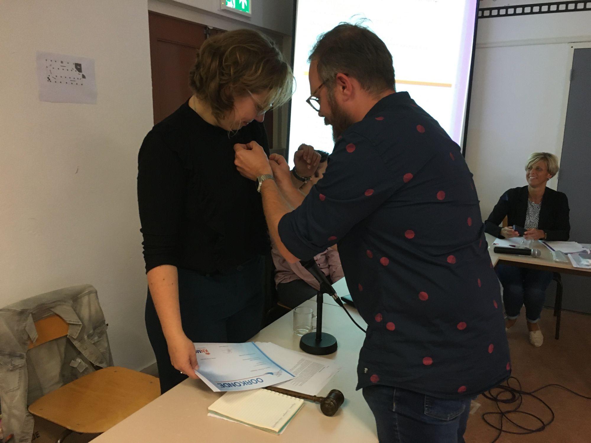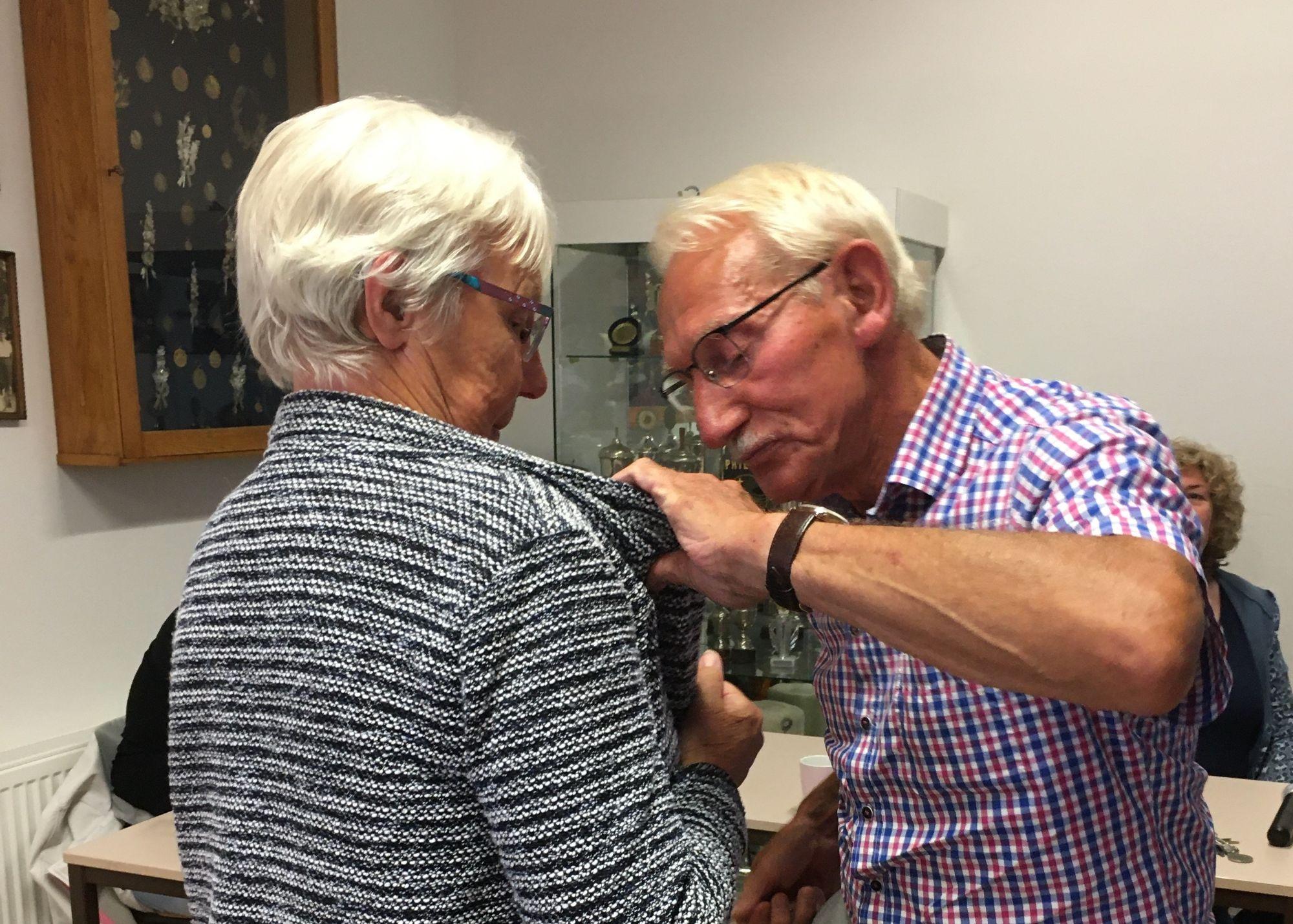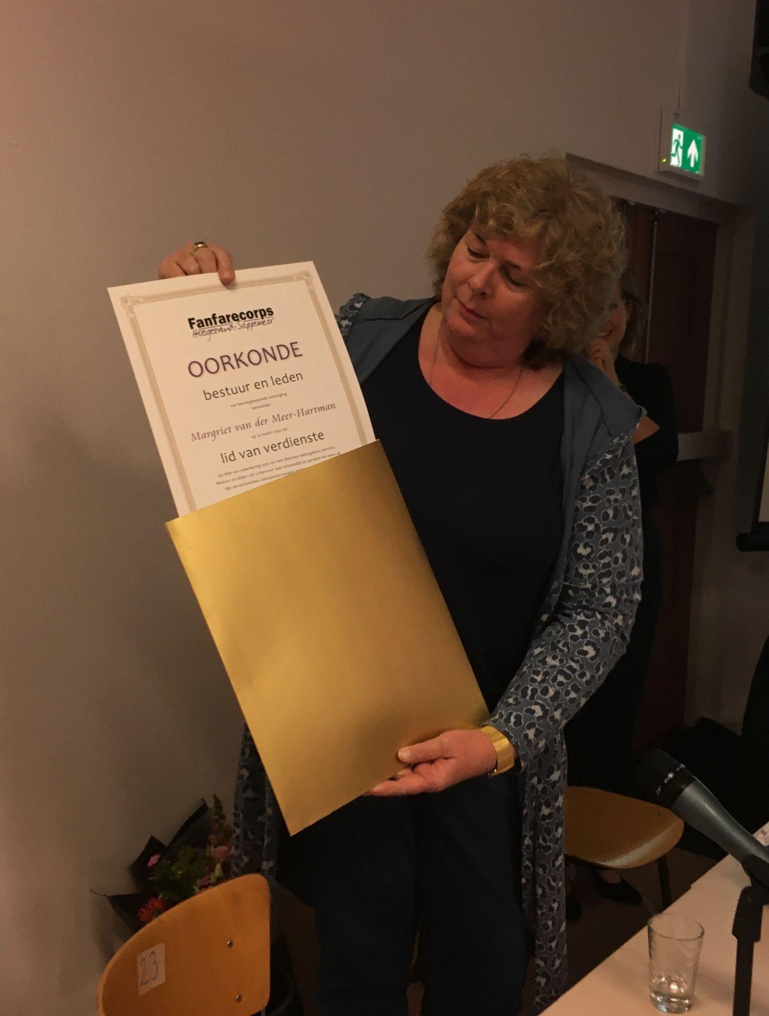 Gisteren vond de uitgestelde ledenvergadering van onze vereniging plaats. Vanwege de corona-versoepelingen kon deze vergadering eindelijk plaatsvinden, maar iedereen moest zich natuurlijk wel aan de anderhalve meter richtlijnen houden. Het hoogtepunt van de vergadering is ieder jaar weer de huldiging van de leden die 25, 40 of 50 lid zijn of zo lang muzikant zijn. Dit jaar waren dat Lidy, Stoffer, Hilda en Dorien. Lidy werd gehuldigd omdat ze 50 jaar lid is van de vereniging, Hilda was 40 jaar lid en Dorien en Stoffer werden gehuldigd omdat ze respectievelijk 25 jaar en 40 jaar muzikant waren. Hoewel Dorien was eigenlijk al 27 jaar muzikant, dus voor haar was het zeker een verrassing. Naast deze huldigingen werd de oud-papier commissie bedankt voor hun jarenlange werk en verdiensten voor de vereniging. Bé kreeg bloemen voor zijn bestuurswerk van de afgelopen jaren en Margriet werd zelfs 'lid van verdienste' vanwege haar jarenlange bestuurswerkzaamheden. Vanwege de corona maatregelen kon de voorzitster geen speldjes opspelden, maar indien mogelijk, waren er familieleden gevraagd deze eer te verrichten.