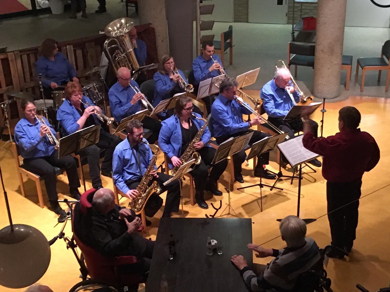 Vanavond speelde ons blaasorkest in huize St. Jozef in Sappemeer. Veel bewoners waren naar de grote zaal gekomen om te luisteren naar de herkenbare muziek uit de jaren 60, 70 en 80. Klanken van het nummer 'Mexico' tot een medley van Bert Kaempfert maakten er een gezellige avond van. Tussendoor werd iedereen verwend met lekkere hapjes en drankjes. Het was voor het orkest voor het eerst dat ze in St. Jozef speelden en dat leverde ook voor de bewoners een leuke afwisseling op tussen de activiteiten die er regelmatig gehouden worden.